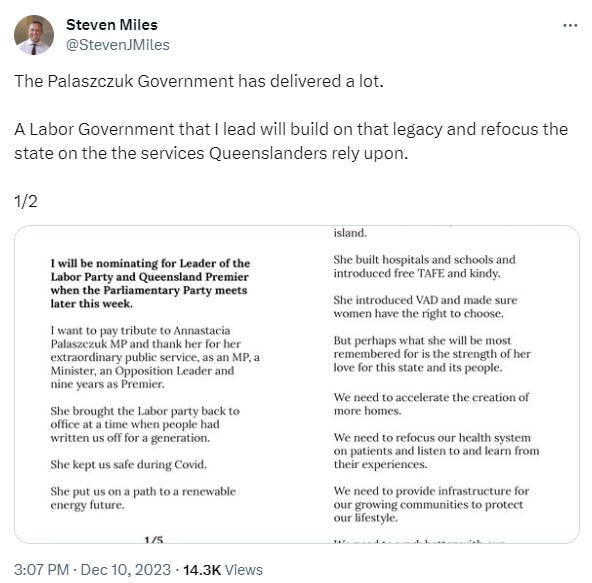 As for whether her successor can turn things around. It is certainly possible. It is inherently difficult for an opposition to win a state election. It typically takes a catalyst. For example, it includes Scott Morrisson’s personal unpopularity, which sunk Dominic Perrottet. But, the Palaszczuk government is despised. It is absurd to think that Miles will gain by tying himself to the Palaszczuk legacy. But, maybe he’ll get lucky.
